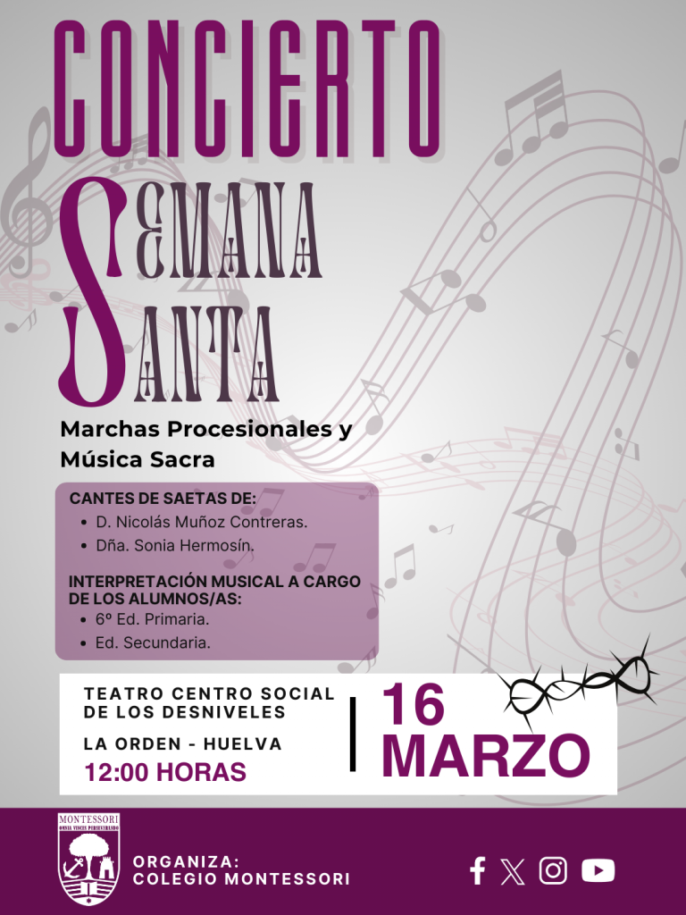 Bajo la solemnidad de los sones cofrades y la emoción de nuestra tradición andaluza, los alumn@s del Colegio Montessori ofrecen un concierto extraordinario con motivo de la Semana Santa.